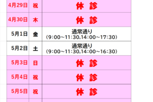 - ※当院の妊婦さんはお休み中も対応いたしますので まずは、お電話でご相談ください。 お休みの前後は混雑...